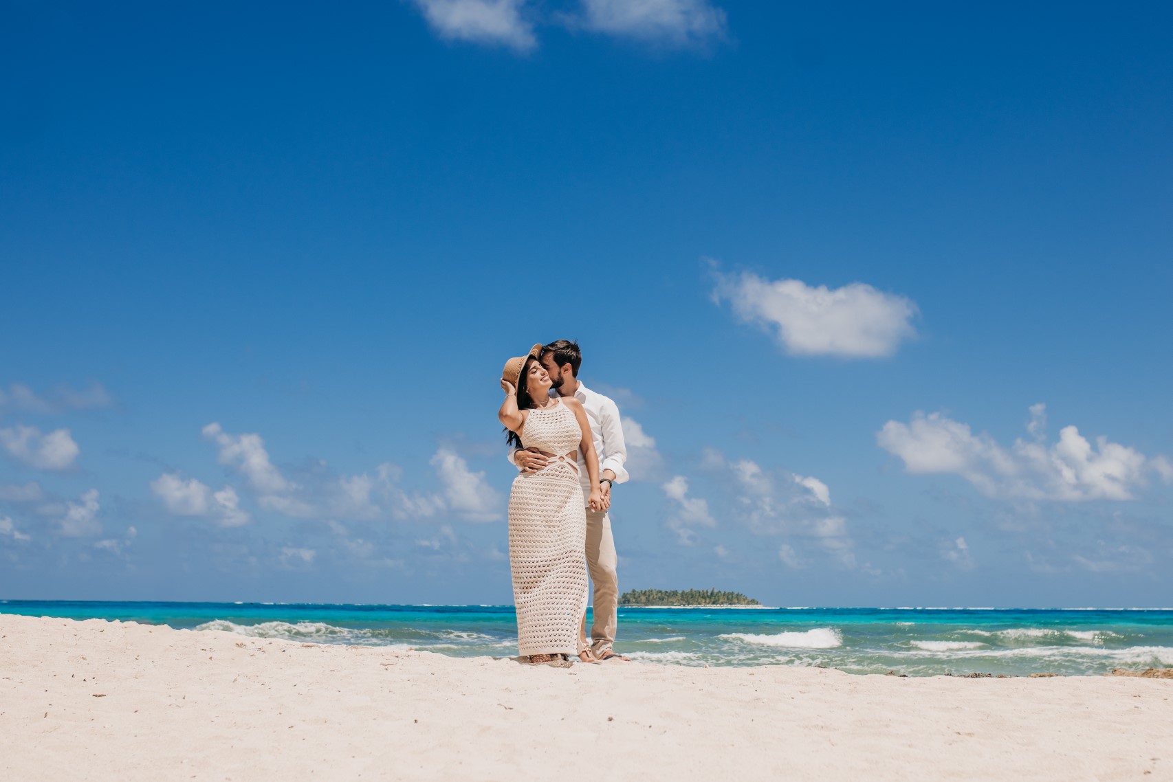 La vestimenta para una sesión de fotos es muy importante. Es recomendable usar colores sólidos, preferiblemente colores pasteles, que combinen con el azul del mar y el beige de la arena. Evita colores muy fuertes y vestidos con distracciones. El blanco siempre funciona como opción, pero sería bueno tener también un color alternativo.